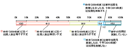 2010年度の新卒採用人数についてたずねたところ、最も多いのは「昨年に比べ採用人数は横ばい予定」の41.2%で、「減らす予定」は 26.8%、「増やす予定」は10.0%となっている。「2009年度より採用人数を減らす」と答えた割合が全体より10ポイント以上高いのは、「卸売・ 小売業」「金融・保険業」「複合サービス事業」。一方、「採用人数を増やす予定」と答えたのは「医療・福祉」で、全体より10ポイント以上高くなってい る。