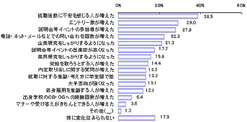 その一方で「大手志向が強くなった」や「終身雇用を意識する人が増えた」は10%台にとどまり、人事担当者は就職先を確保しておきたい学生の焦燥感を感じ取っているようだ。